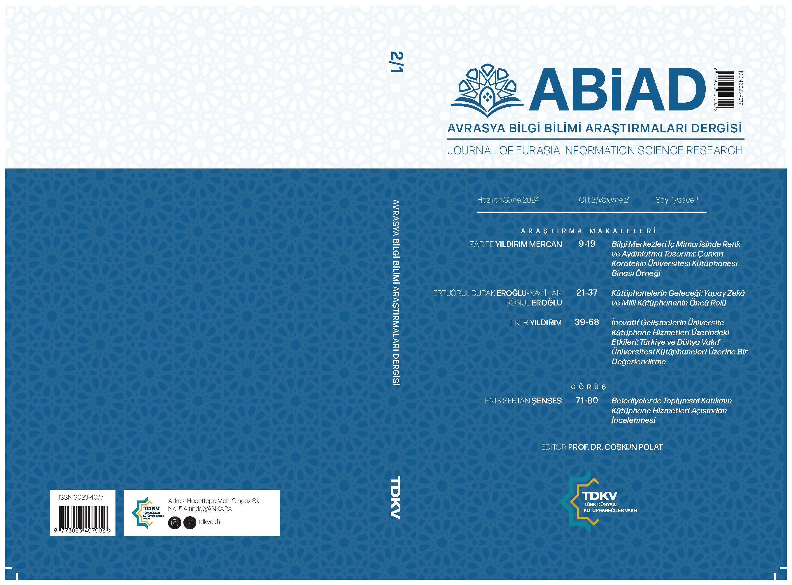 Vol. 2 No. 2 (2024)Türk Dünyası Kütüphaneciler Vakfının Akademik Yayınıdır. Haziran ve Kasım aylarında olmak üzere yılda iki kez yayımlanır. Kütüphanecilik ve bilgi bilimi alanında özgün araştırmalara, görüşlere, duyurulara ve haberlere yer verir.